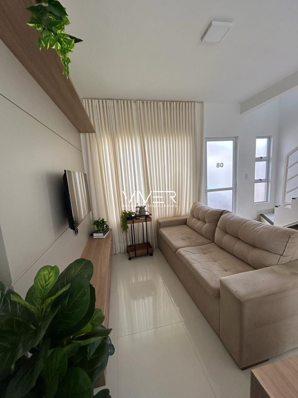 Sala com painel planejado, ar condicionado, cortina, TV Samsung 55 polegadas, móvel planejado embaixo da escada