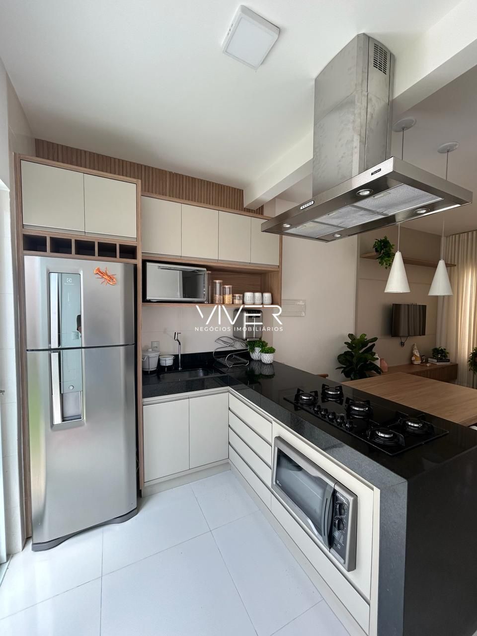 Cozinha contendo móveis planejados, com mesa, geladeira, coifa de ilha, microondas, forno, cooktop, purificador de água, todos eletrodomésticos são de inox
